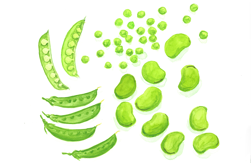 In the fields, peas flower and soft pods begin hanging from the plants.